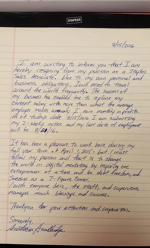 See this picture above, that is my resignation letter I turned in on August 15th this year and I fired my boss and quit my job at Staples.