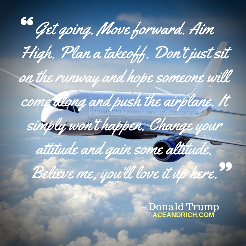 I love this quote by Donald Trump, he said: “Get going. Move forward. Aim High. Plan a takeoff. Don’t just sit on the runway and hope someone will come along and push the airplane. It simply won’t happen. Change your attitude and gain some altitude. Believe me, you’ll love it up here.”