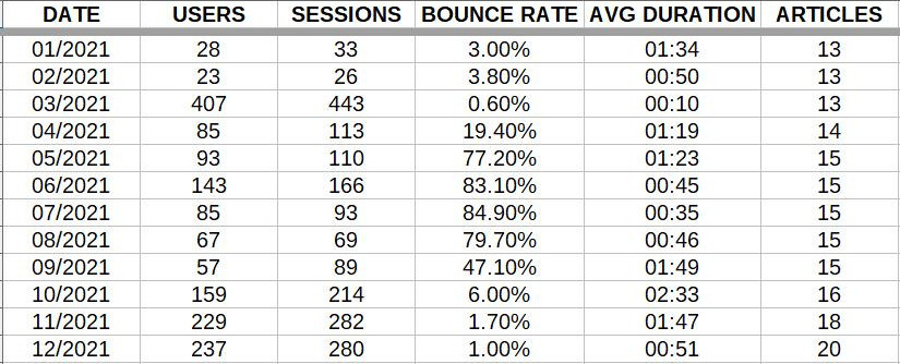 So to start with I will be analyzing the data that GA emailed me, which I created a spreadsheet with. I am not sure when I set up my GA, but the first email report I have is from July 2020. So Let's analyze that 2020 data! The spreadsheet starts in June, however the graph covers the whole year.