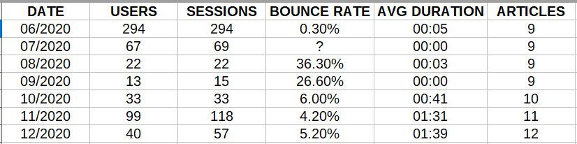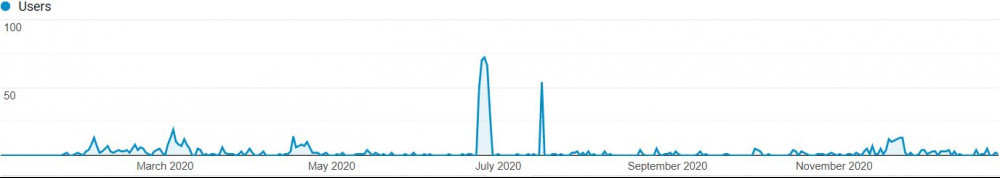 The beginning months of 2020 I was obsessing over these metrics and trying to figure out why keywords weren't ranking, when I should have been making more articles! There was a giant spike in users in June, unfortunately I never saw it or I might have been motivated to produce more. The reason for this is that is around that time both my Dad and my Grandmother died. After the funerals I became even more severely depressed for many months, which as you can see was not good for productivity.
