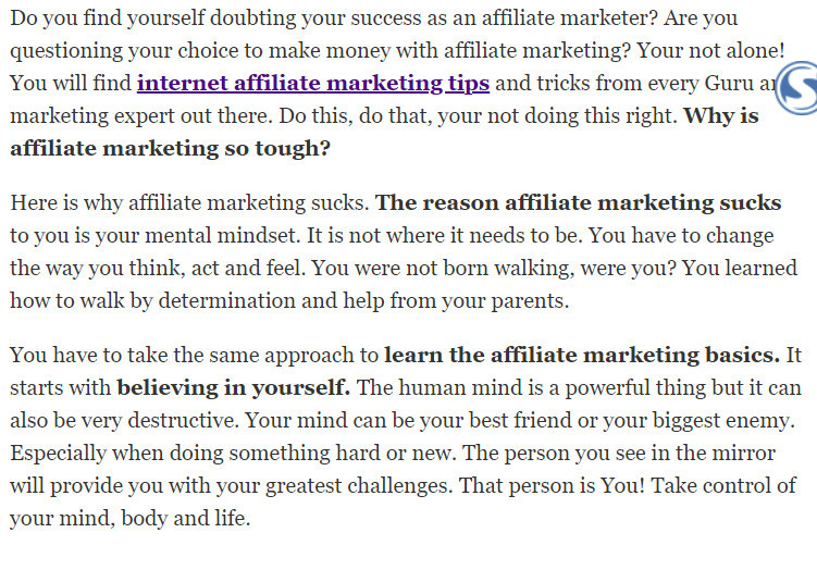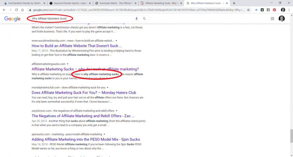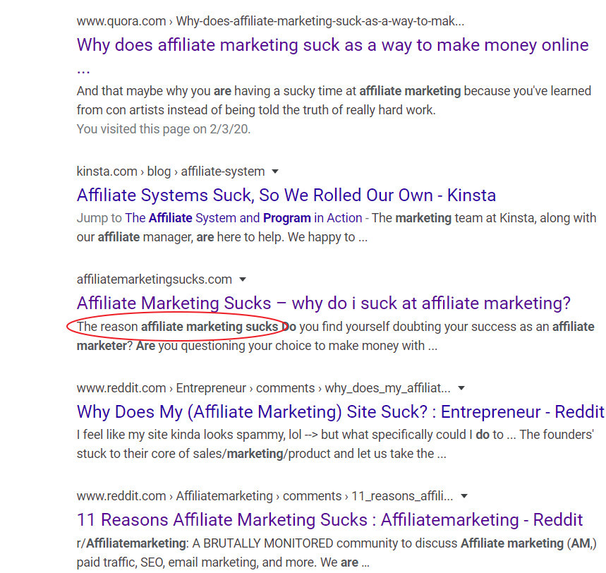 Notice the description circled in red. It is giving an answer to the question. Now this phrase " The reason affiliate marketing sucks" is bold text in my second paragraph. The rest of the snippet is my first paragraph and in my meta description. Google is emphasizing the answer before my meta description and the first paragraph. Pretty remarkable is't it?