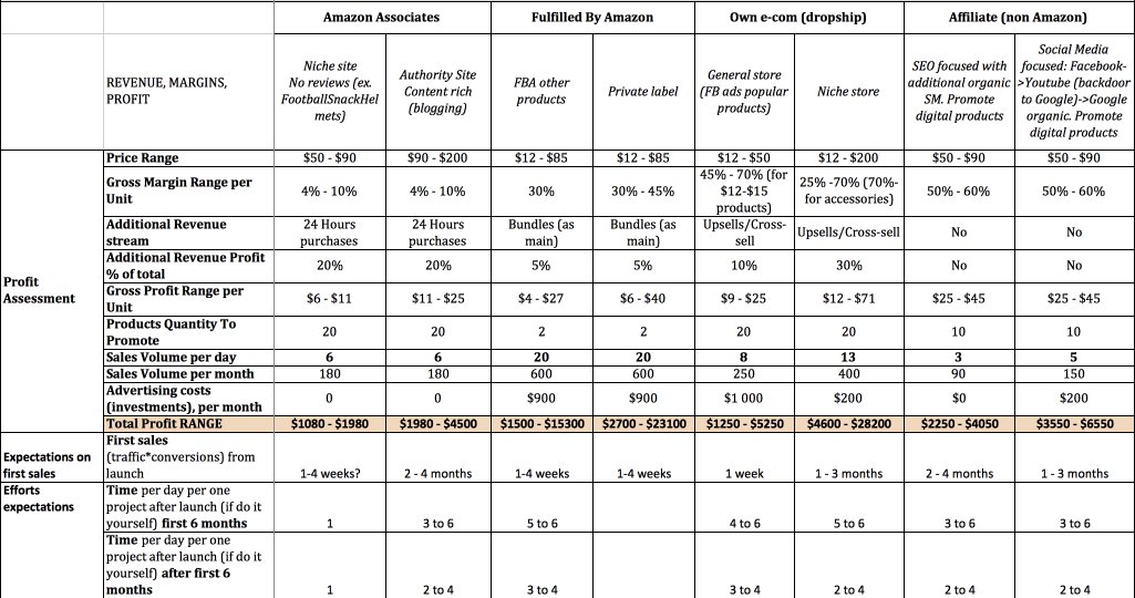 These are very high level assumptions based on potential sales and 'realistic' margins FOR NEWBIES. I totally understand that it highly depends on a Niche and Efforts. But still, when you are focusing on low competition keywords, that means low traffic. And if we multiply expected traffic volume by conversion % (1-3%) we can arrive to some 'realistic' ranges.