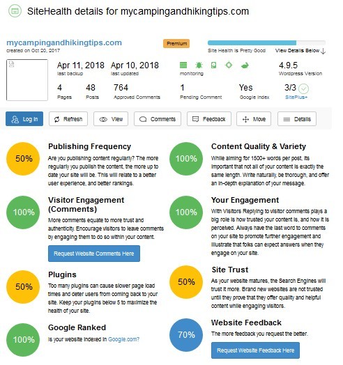 Currently, at my website, My Camping and Hiking Tips, I have 48 posts, 764 comments (half are mine), and 50% site trust. My traffic is not where I want it to be at, but I am still in the Google sandbox. It will take time, but that is part of the process here.