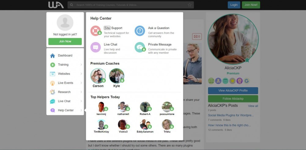 This aspect of Wealthy Affiliate is the one that really has nothing to do with whether you have an existing website and where it is hosted. The community is amazingly supportive. Inside Wealthy Affiliate is what I would describe as a social media platform. You can have a live chat with members, send personal private messages, ask public questions, write blog posts (like this one), follow other peoples profiles and comment on training modules and profiles. It sounds like a lot but its pretty easy to see what is happening once you are logged in.