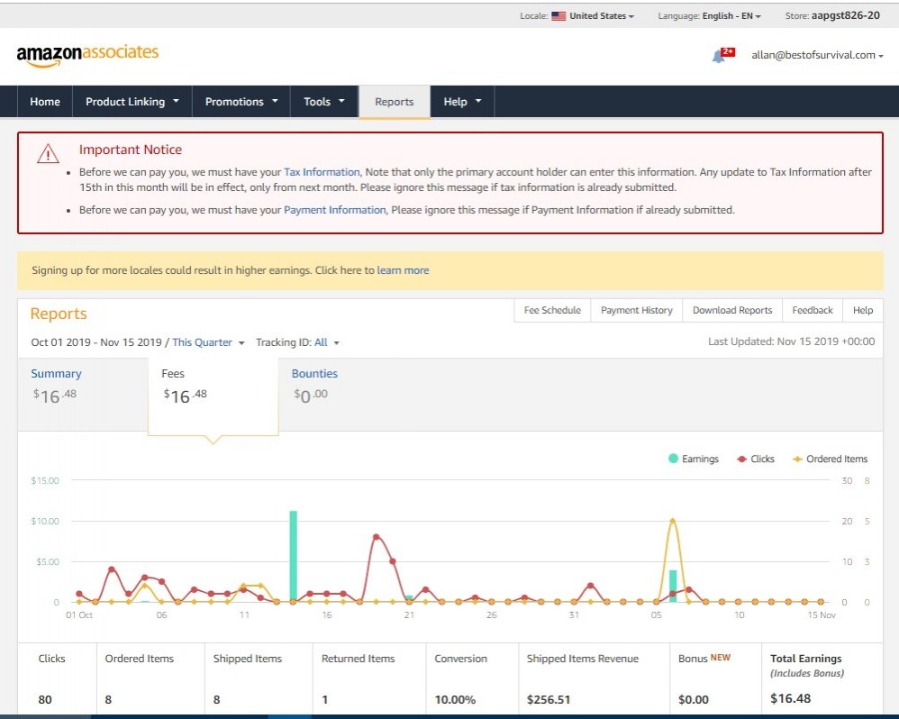 It is not much but it's a good start. Last October 26, 2019, I received a congratulatory message thru e-mail saying that my Amazon Associates account has been reviewed and approved. It had garnered 8 ordered items, shipped 8 items, and 1 returned item, total earnings of $16.48.