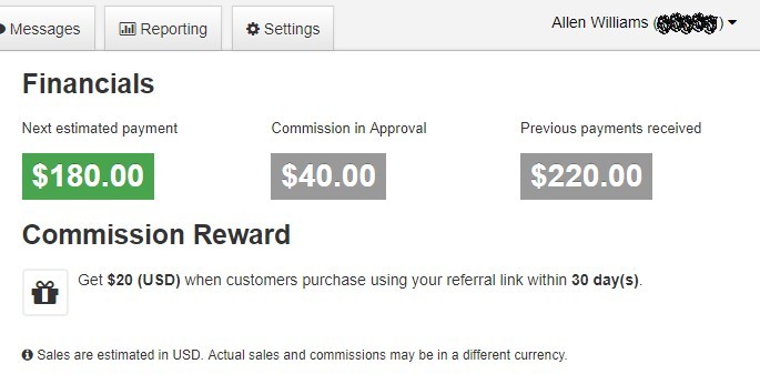 Below illustrates the current earnings on one affiliate product I promote on one of my blogs. The commission rate is set at $20 each sale.