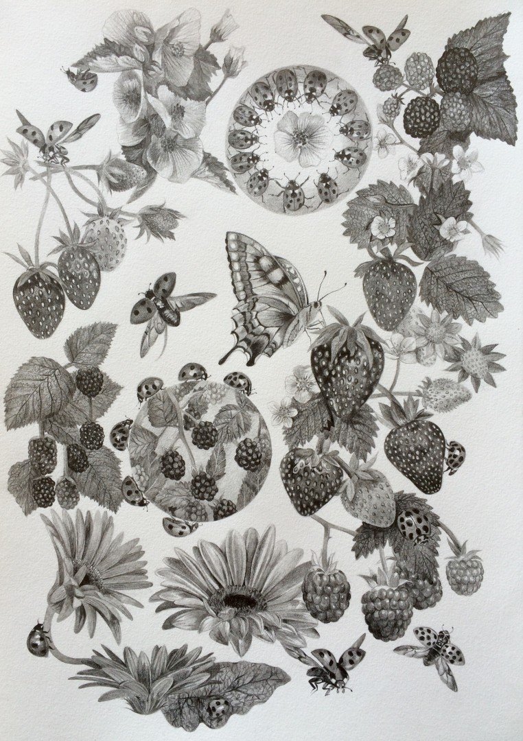 I was so inspired by these old school clips that I created a new piece based on the lady bugs picnic clip. I loved that little song and used to sing it a lot and wanted to re-create the bugs having a picnic complete with berries and marshmallows. Instead of marshmallows I drew the beetles feasting on marshmallow flowers :o)