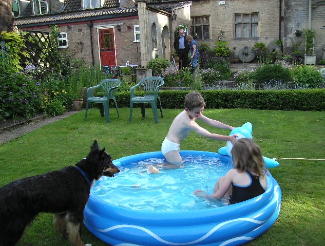 "Gorgeous house eh? Thats where my parents live. My father was a master builder - he did o.k for himself. It used to be a school. That's my mum and my brother in the background. He lives in the other side of the school. The kids are my daughter Ffion and my son David and my old dog Dill. It's an old photo. The kids are 15 and almost 13 now.