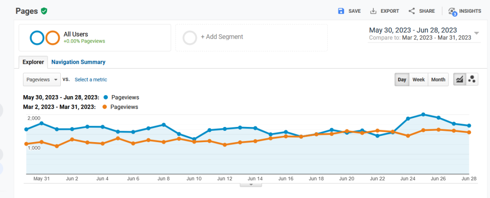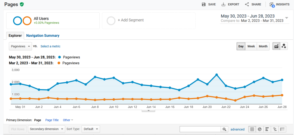 Note that the orange line is the last thirty days of traffic before we started publishing on TN, and the blue line is our traffic from the last 30 days (pretty much June’s traffic). We’ve pretty much doubled our traffic for this site (TN)!
