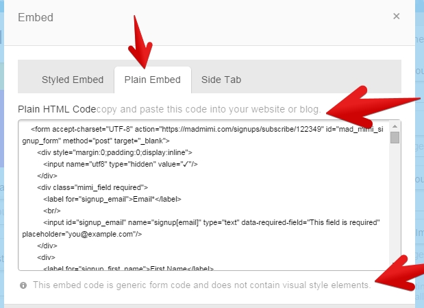 Mad Mimi offers 3 ways to embed code. Yes I did freak and yes, Phil, my eyes did just kind of go out of focus after I read 'HTML'!
