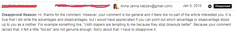 "Disapproval Reason: Hi, thanks for the comment. However, your comment is too general and it feels like no part of the article interested you. It is true that I did write the advantages and disadvantages, but I would have appreciated if you can point out which advantage or disadvantage stood up to you as a mother. For example something like, "cloth diapers are tempting to me because they stop blowouts better". Because your comment lacked that, it felt a little "forced" and not genuine enough. Sorry about that. I have to disapprove it."