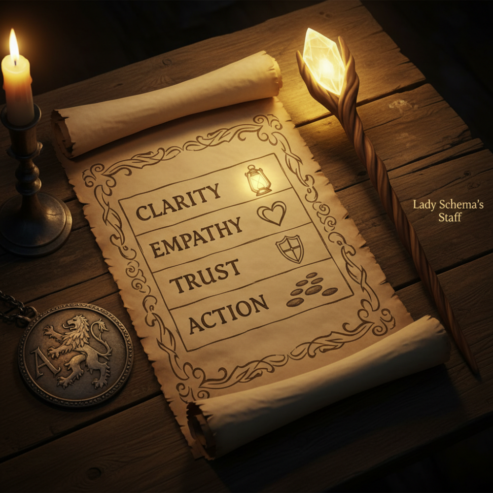 Arthur paused. “But what if they’re afraid to act?” Lady Schema raised her staff. “Then offer a step so small, they forget it’s a leap”.