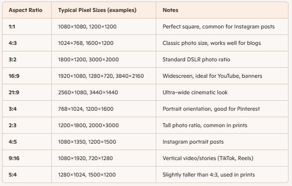 Common Aspect Ratios to Pixel Sized with the Image Studio and in General