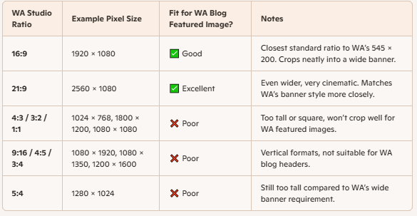 - Use 16:9 or 21:9 in WA Image Studio for blog featured images.