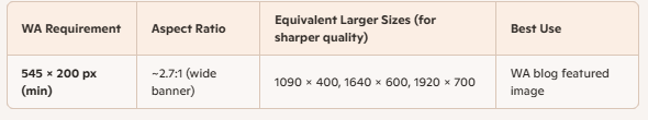 - 21:9 (2560 × 1080) is closest to WA’s 545 × 200 minimum ratio, so if you want a perfect wide banner look, this is the winner.