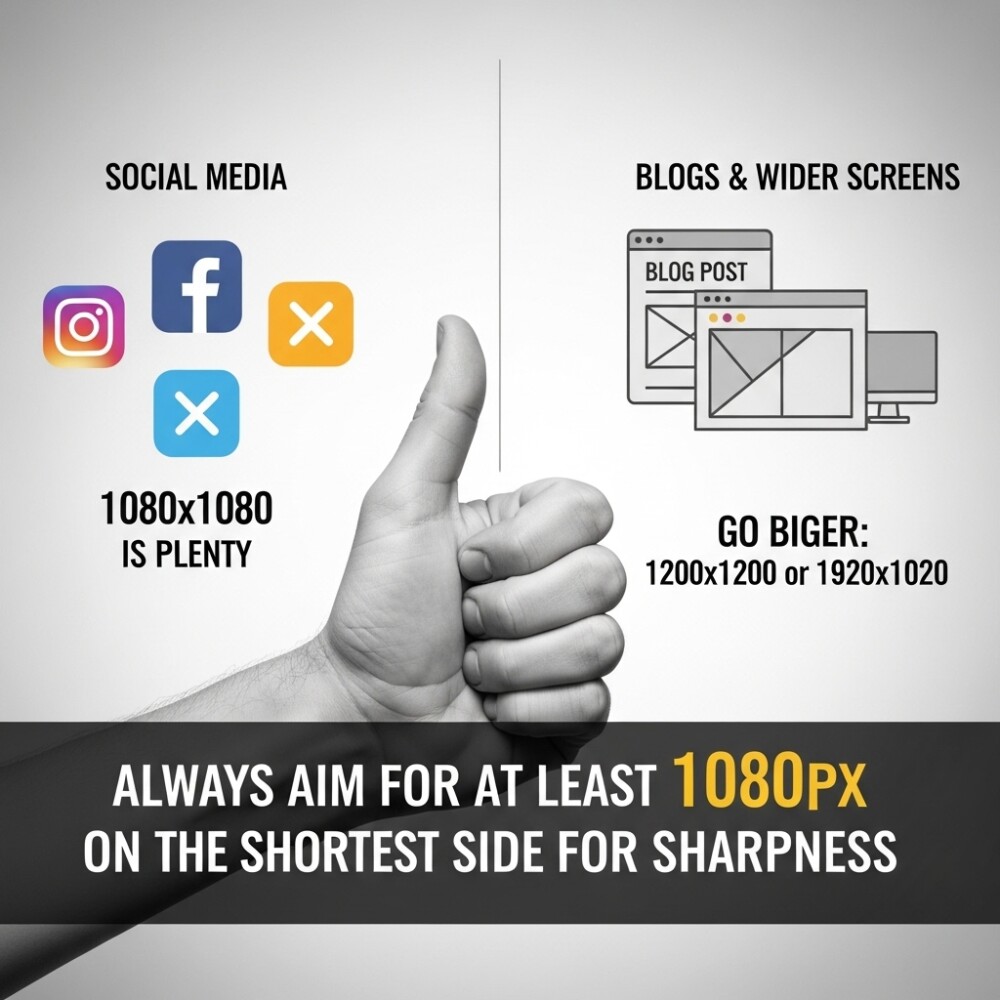 - Always aim for at least 1080 px on the shortest side, that’s the modern “safe minimum” for sharpness.