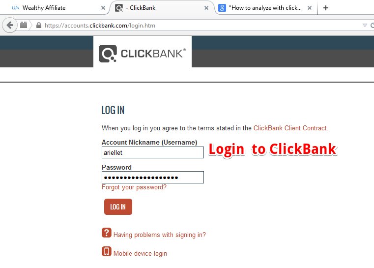 Step 1:) Login to clickbank: Go to http://clickbank.com and login with your username and password. If you don't have an account, click the sign up button and put your information.