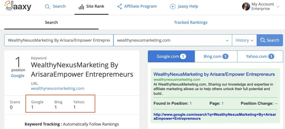 I am thrilled to share some exciting news with all of you! Our site, WealthyNexusMarketing.com, by Arisara has achieved the #1 ranking on Google, Bing, and Yahoo for the keyword "WealthyNexusMarketing By Arisara/Empower Entrepreneurs." This accomplishment is a testament to our hard work, dedication, and the power of affiliate marketing.