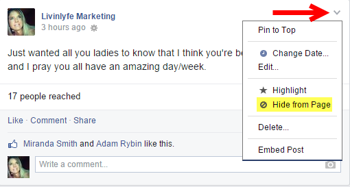 Find the post you want to hide, click on the down arrow then choose Hide from Page.