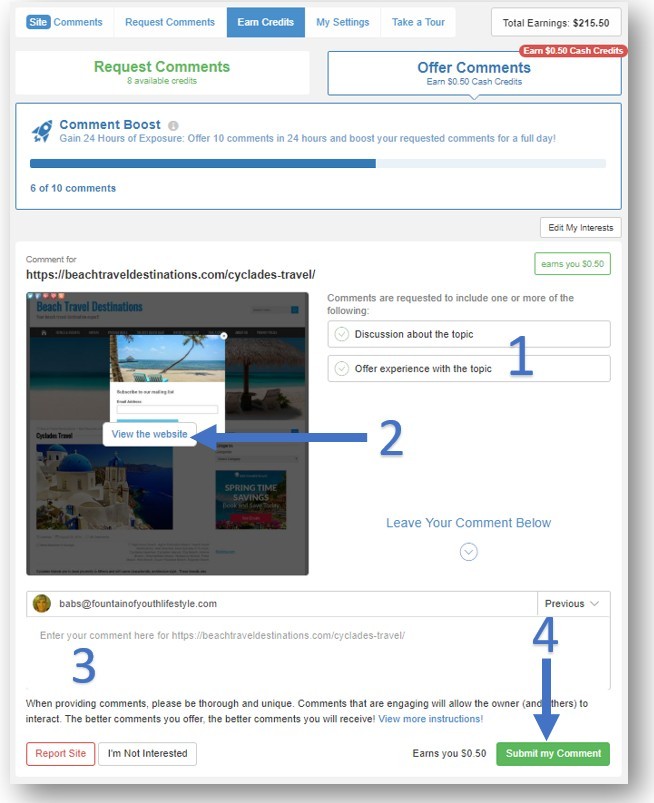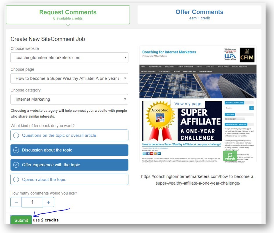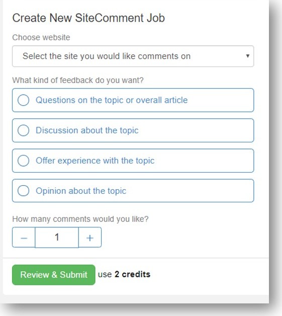 Click and choose which site of yours you would like comments on, click each of the boxes to tell the commenters what types of comments you want (you can choose as many as you want) and how many comments do you want?