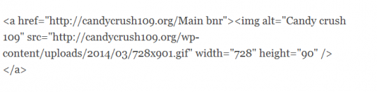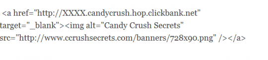 This is a screen shot enlarged so you can see the html code of a Clickbank banner on my candy crush blog, when it is first uploaded on my blog without my unique affiliate link in it
