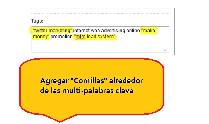If you type your keywords in quotes, like this: "twitter marketing" "make money", then you have groups of words that end tags as several individual words.