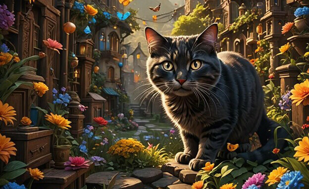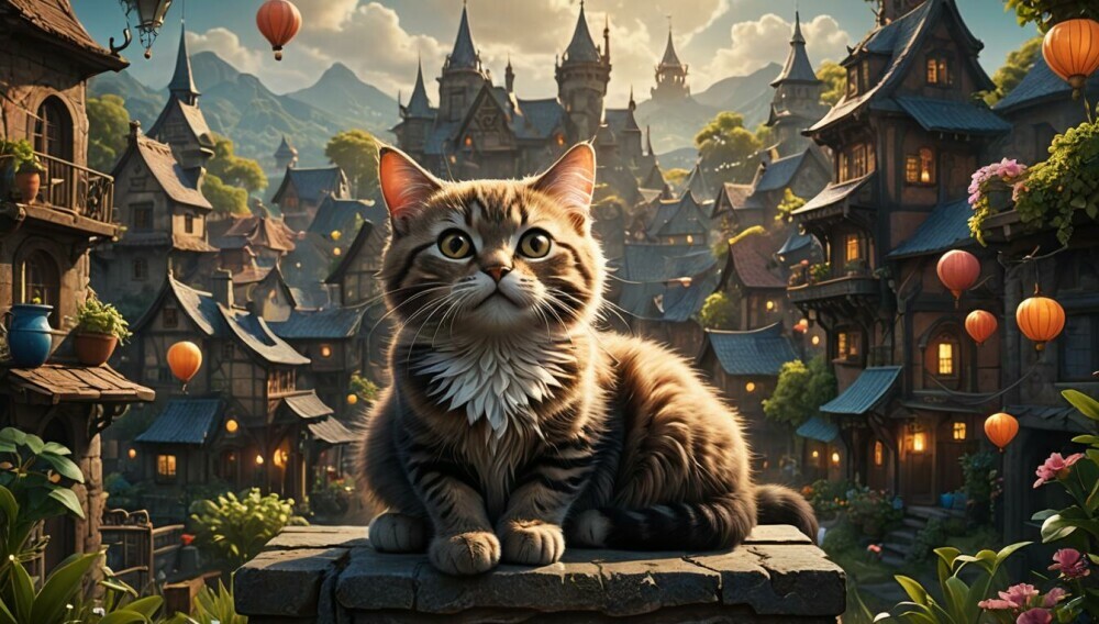 Prompt: A visual representation of the essence of pure happiness, capturing the feeling through symbolism, metaphor, and atmosphere containing a cat.
