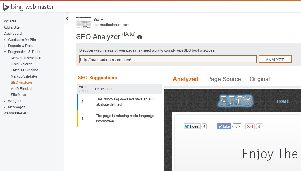 When you create a Bing webmaster tools account, apart from the obvious benefits of listing your website with Yahoo and Bing search engines which account for about 30% of internet searches, you also get access to some free tools such as SEO Analyzer.