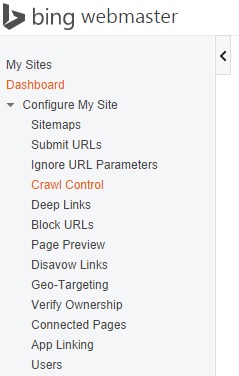 The Crawl Control feature in the Configure My Site Section allows you to exert control over the speed at which Bingbot makes requests for pages and resources on your website. You can tell Bingbot to crawl your site faster or slower than the normal crawl rate for each of the 24 hours in the day. This way you can to limit Bingbot activity when your visitors are on your site and allow us more bandwidth during quieter hours.