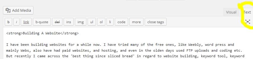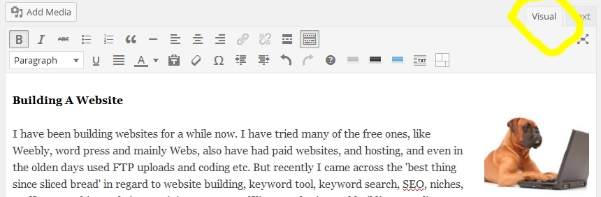 However, it was only recently, like the last week, that I realized that when I type in my content, that I can do it in visual as well, not just text. I have been typing all my text and links and adding media to the text page.