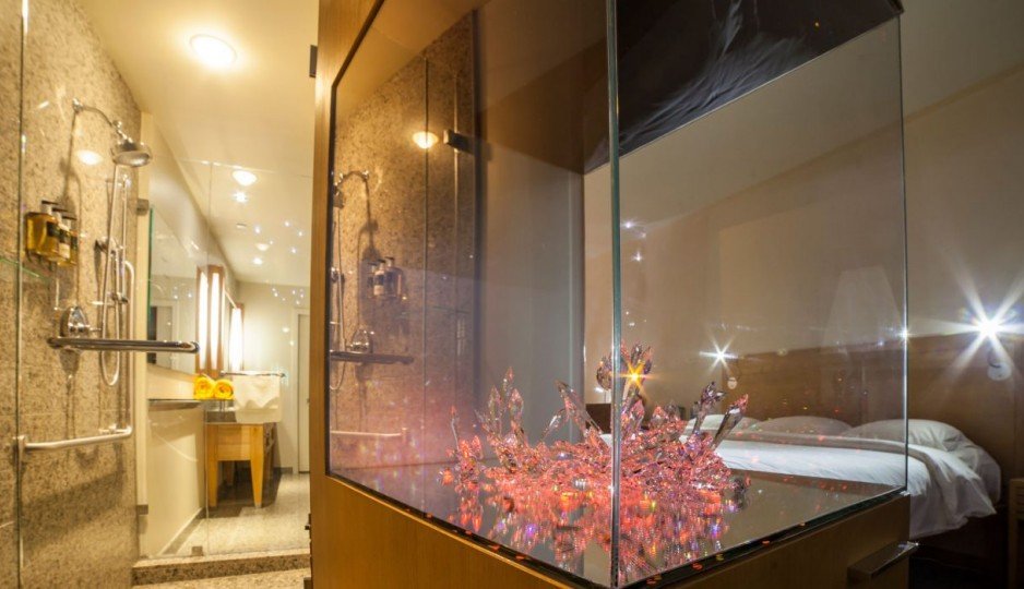 I am attaching a photo I took of the bed/bath area. That big case in the center of the photo is about $50,000 worth of Swarovski crystals. The whole place is built with the healing properties and such of these crystals front and center. I read the introductory brochure in the suite and it said that there were over 3.5 million Swarovski crystals used in the construction of the building. The whole resort cost about $0 million to build.