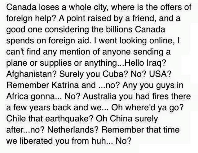 Good Questions Big. Canada does help a lot of other countries and I don't think we ever ask for anything back. 1600 homes and businesses....GONE....could cost up to $6,000,000,000 in insurance claims and that probably won't be enough to get people's lives back to some kind of normal. Who know how long these people are going to be out of work or will ever return to the city they love. It's a tragedy and it ain't over yet.