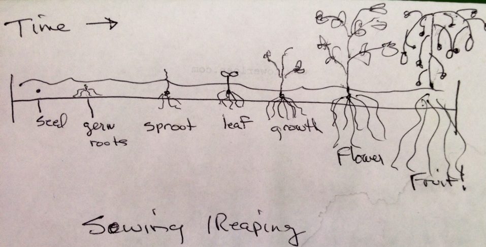 A quote from the Bible says something like this... "Unless a grain of wheat falls to the ground and dies, it will bear no fruit..." Here is a stick drawing to illustrate.
