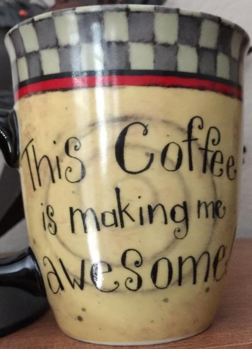 I start my mornings with a cup or two of java. Strong, rich java. It helps all three of my brain synapses fire at the same time. The picture of my coffee cup tells it all.
