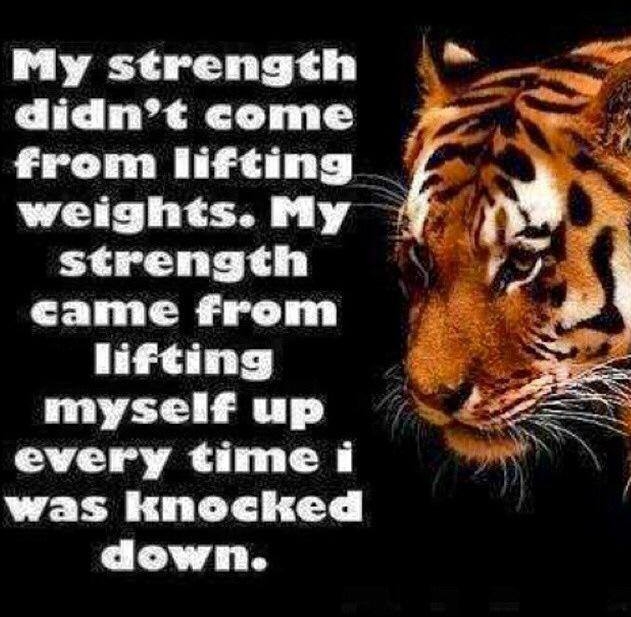 The tiger say,s it all.I am not sure where my strength comes from but although I struggle quite a lot I am a born again Christian also and though I could not say I am close to God now I still could not live without him.I think I would have crumbled a long time ago without Jesus,even walking up the beach I just chat to him;I know there will be people here that will say are you crazy but other true Christian,s know that once Jesus is in your life and even though we struggle we still hold unto him because we all know "All things work together for all of us who love the Lord".