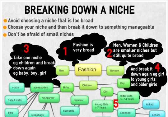 Here is a pictorial example of how you can break down a niche. I chose fashion but you could use this method with any niche you chose. Also you can choose to break niches down in different ways - so be flexible and play around with ideas before you make your final choice.