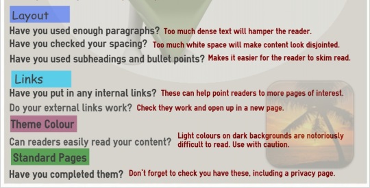 One of the great things about WA is that you can always ask people to review a page/post/site and ask for their comments. However, sometimes people are busy and as you're learning to build your site, you also need to acquire the skills to assess some things for yourself.