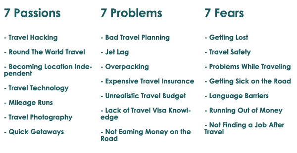 If you are new to online business then a common niche selection strategy is to write a list of 7 ideas from the following areas: Passions, Problems and Fears.