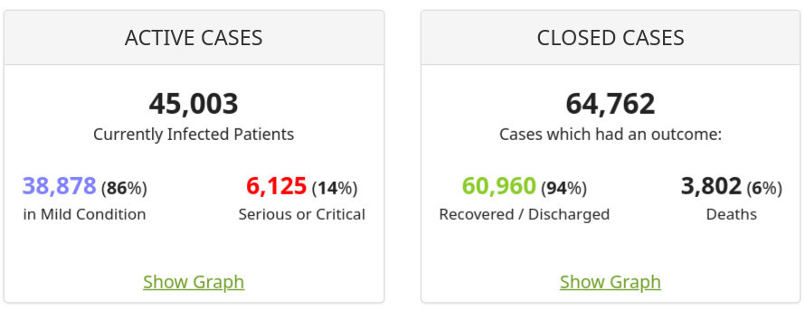Of that 109,765 "recorded" cases of COVID-19 only 3,802 have died and the majority, 60,960 have fully recovered, with 45,003 still being treated. You can keep track of all the daily updated totals of COVID-19 and a breakdown by country of infections, deaths & recoveries at the WorldOMeter website.