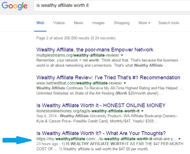 I create some of my WA Blogs, like the one at the link above, the same way I create my website content, with a keyword in the title. According to the WA Keword Tool the keyword "Is Wealthy Affiliate Worth It" has a Competition Results (or QSR) of 66. It's a low hanging fruit keyword.