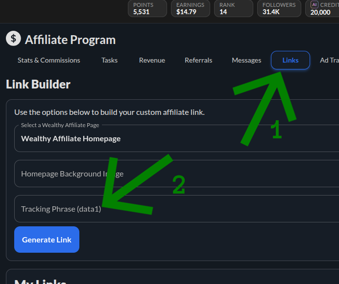 The Tracking ID screen looks different here, see below image, but getting your affiliate link with tracking is the same. Once on your Affiliate Program Stats screen click the link tab (#1) and it will bring up the custom Link Builder. Then in the appropriate area (#2), type in your Tracking ID and click "Generate Link" button.