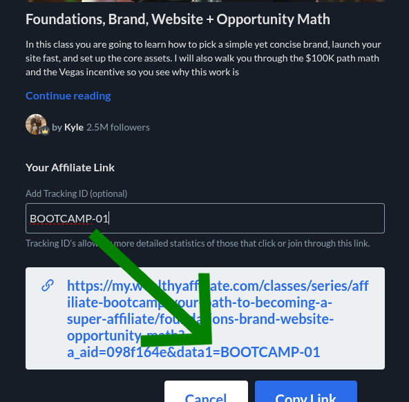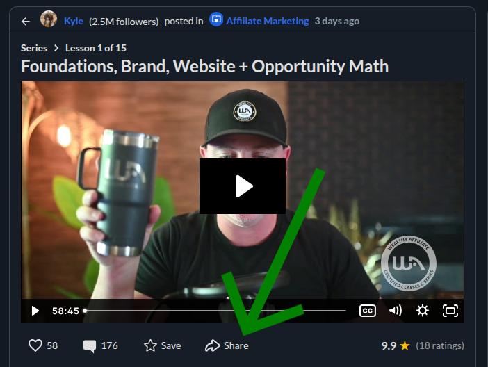 However, when sharing on social media or in an email, you don't have to be relevant to a specific niche. In these cases, and where the shared content is relevant, you want to make sure the WA content is from your affiliate link to that content. For example, let us say you want to share Kyle's Boot Camp lesson.
