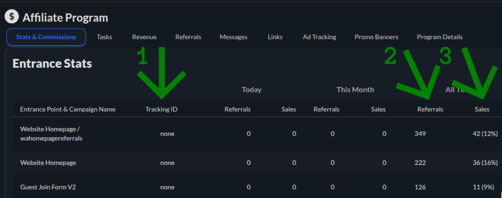 As you can see in the below image, you will see the affiliate link in the left column, then the Tracking ID in the second column (#1) arrow. Then moving right you will see Referrals & Sales for the day and the month. Then the All-Time stats for Referrals (#2) arrow and Sales (#3) arrow. Notice these do not have Tracking ID's.