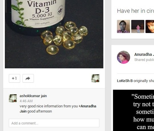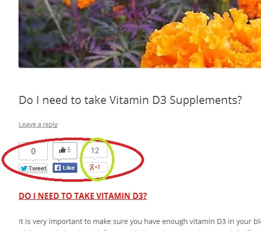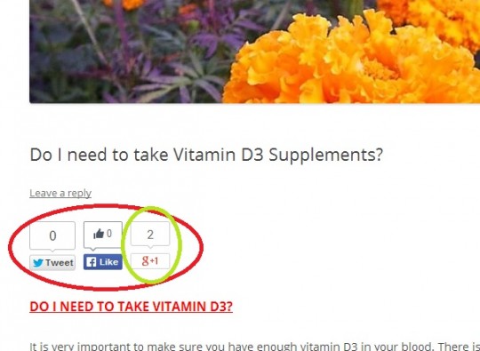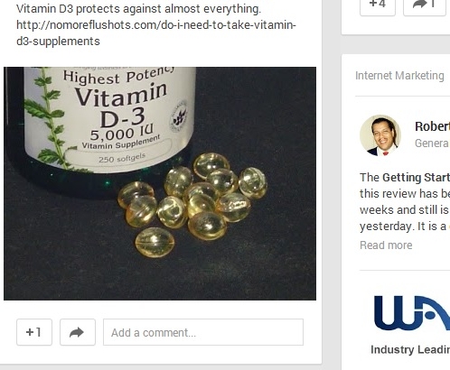 PIC - 1: I took a picture from a page from my flu shot website that was about the importance of taking vitamin D3 supplements. When I started out as you can see, the social signals were 0 = Twitter, 0 = Facebook, and 2 = Google +. Even though I shared this picture and link to the webpage on Facebook as well as Google Plus, for this explanation we will just focus on the 2 = Google +.