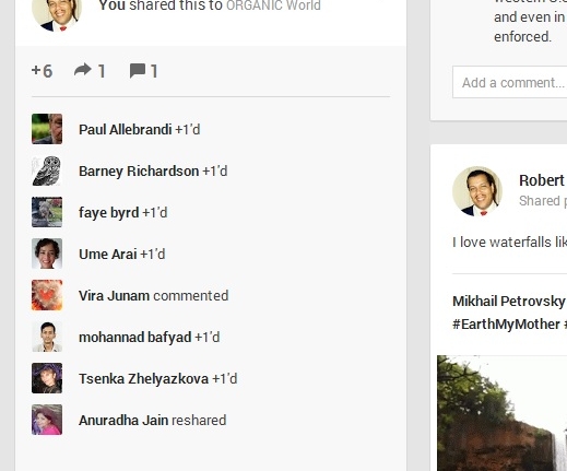 PIC - 3: Then I received 6 community members who +1’d my picture and link, 1 member commented and the last member re-shared my picture and link. So that is 6+1+1= 8. Now add that 8 to the total of 3 from PIC - 2 and we have a grand total of 11 social signals.