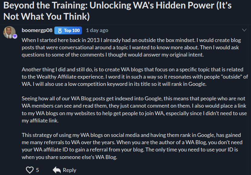 Great points! The combination of the updated training, the helpful community, and the access to tools like Jaaxy makes Wealthy Affiliate a top choice for learning affiliate marketing.