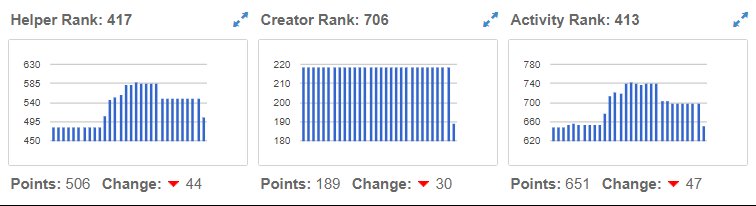 As you can see, my helper and activity ranks are in the low 400s, while my creator rank is about 700. So since my creator rank is significantly lower than the other two, I can make a significant change in my total rank by creating more content (blog posts and training).