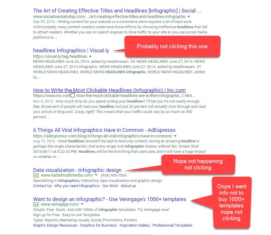 I searched “headline infographics” in Google to find the websites in the picture below. These websites below worked hard to get to the first page of Google.