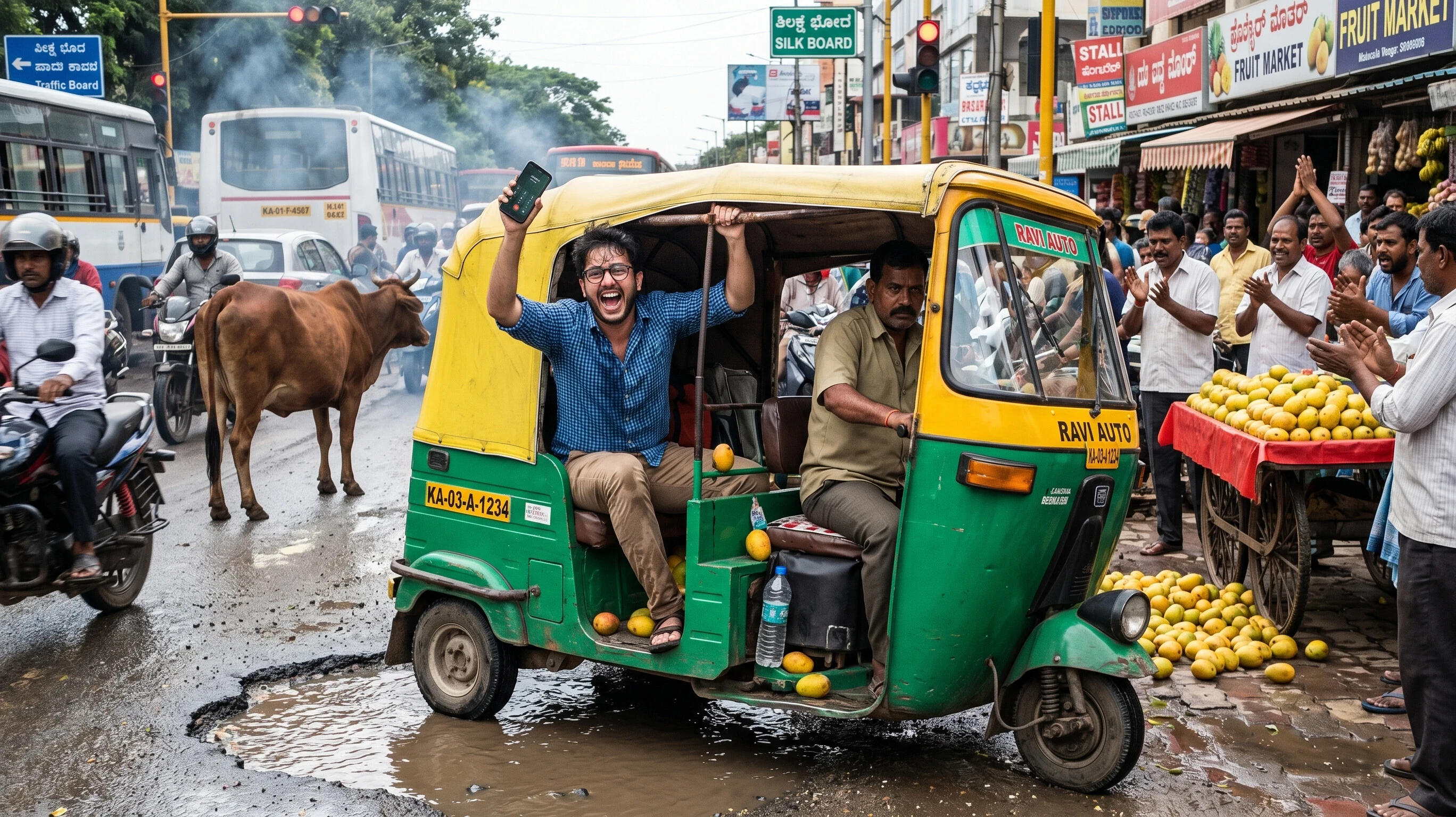 Bob flags down an auto-rickshaw for a quick trip from Indiranagar to Koramangala, hoping to dodge the usual road madness. What starts as a simple haggle explodes into a whirlwind of swerves, shouts, and surprise friendships, with Jenny cheering from the sidelines via frantic phone calls.