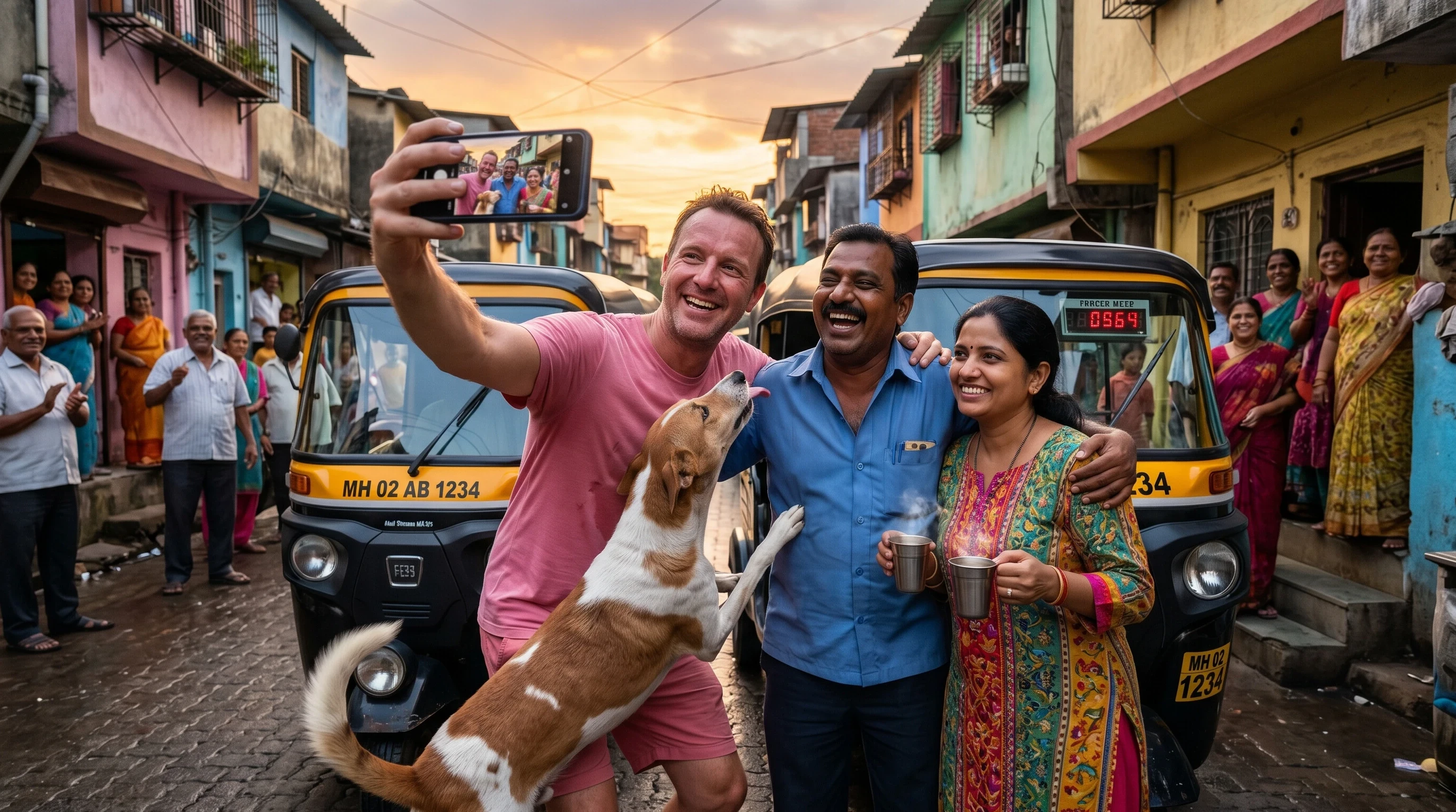 Blocks from the destination, Ravi's meter freezes at triple the price. "Broken magic—pay up or walk!" Bob leaps out dramatically, starting a playful chase. Ravi follows, both stumbling over a wagging stray dog that steals the show. Neighbors pour out, cheering "Go Bob!" Ravi collapses in giggles first: "You crazy pinkie—ride's free forever. You're my lucky charm!" Jenny arrives right on cue with steaming chai, hugging them all. They snap a group selfie, dog included, as the sun sets. Bob grins at Jenny: "Another adventure conquered, thanks to you."